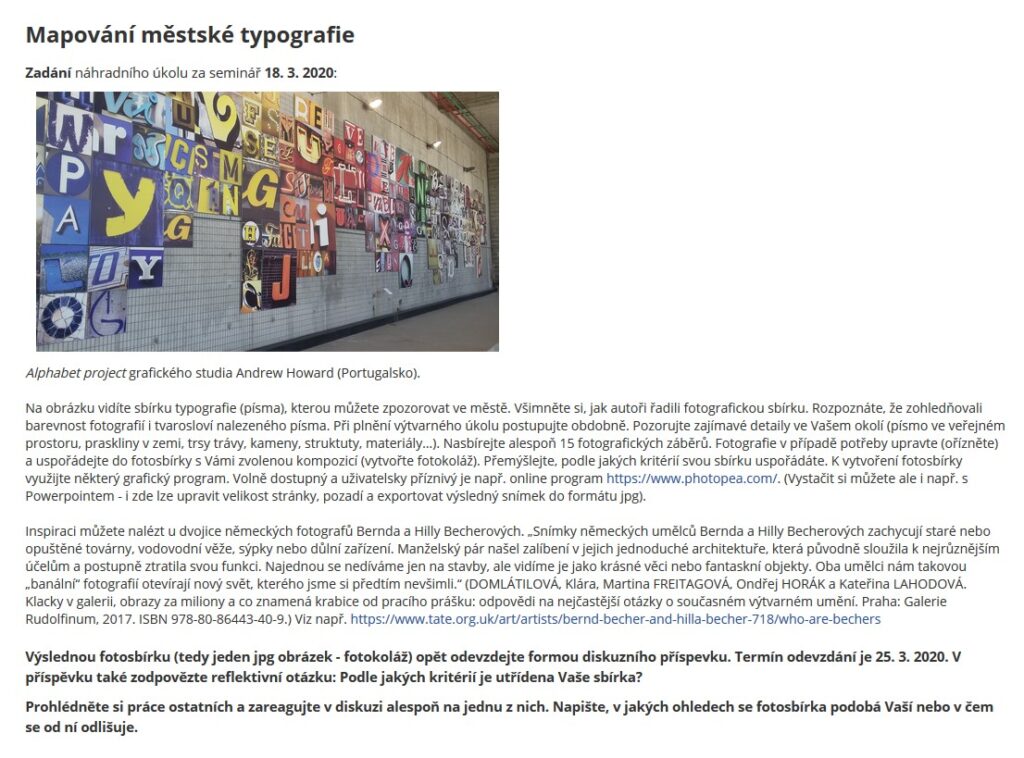 Vložení řešení výtvarného úkolu (fotosbírky dle vzoru B. a H. Becherových) do Moodle ve formě diskuzního příspěvku. Autorka je studentkou programu učitelství pro 1. stupeň.