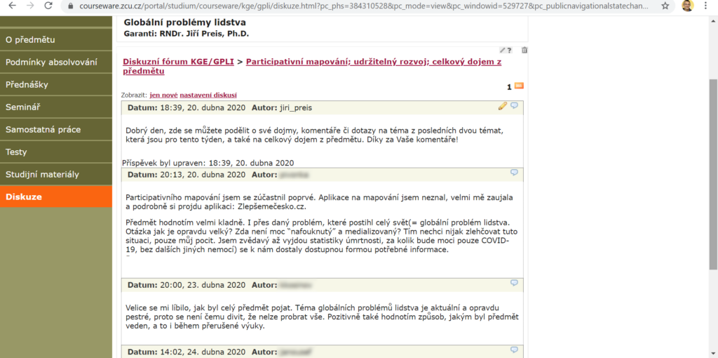 Navzdory nepříznivým okolnostem se nám podařilo mapování uskutečnit alespoň v pozměněné podobě, a tak se studenti seznámili a) s metodami sběru dat v terénu, b) se způsobem jejich využití, c) s dalšími podobnými vhodnými aplikacemi. Studenti aktivitu plnili samostatně jako jednotlivci, zasílali ve stanoveném období data z terénu z mobilních telefonů a já jsem je následně seznámil s výsledky. Nakonec proběhla diskuse na Courseware.