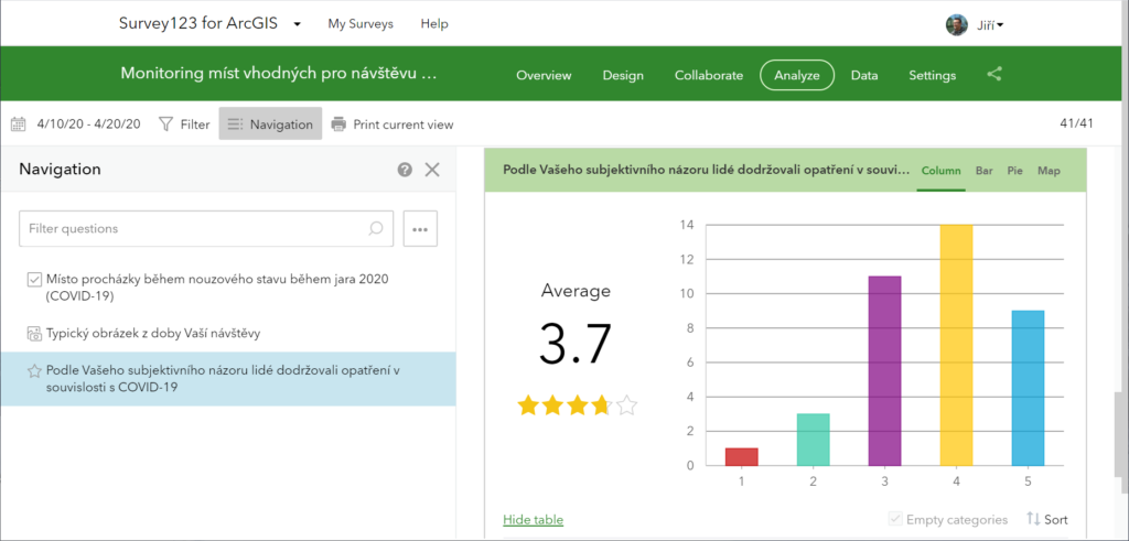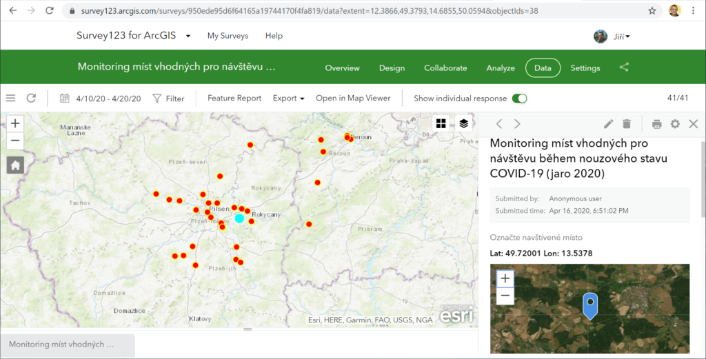 Jedním z úkolů, které studenti museli řešit, byla účast na participativním mapování jakožto příklad lokální odezvy na vybranou globální problematiku pomocí Survey123 na platformě ArcGIS.com. Tato aktivita byla předem plánovaná, ale vzhledem k vyhlášenému nouzovému stavu jsem musel původní plán trochu modifikovat (původně měli studenti pracovat v týmech a na vymezeném území).