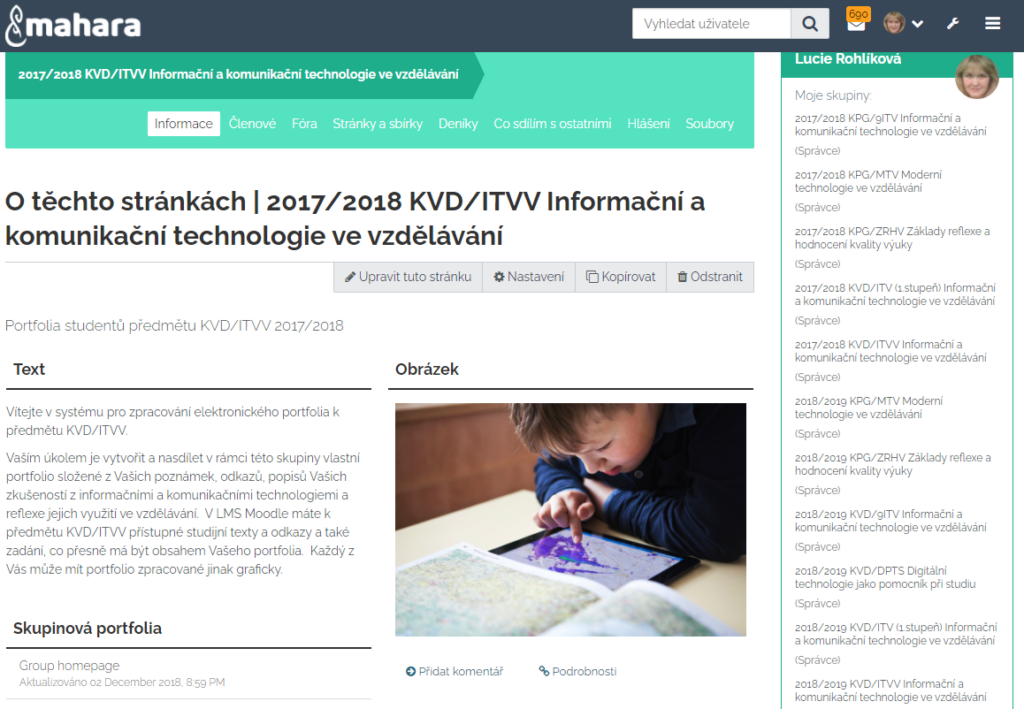 Lucie Rohlíková: Již třetím rokem vyučuji předmět „Informační technologie ve výuce“, který je realizován distanční formou. Před nasazením e-portfolia měli studenti za úkol odevzdat na konci semestru jednu komplexní práci v podobě vlastních webových stránek. V souvislosti s rychlým rozvojem digitálních technologií se ale ukázalo, že je třeba změnit zaměření předmětu a studentům nabídnout možnost seznámit se s pestřejší škálou informačních a komunikačních technologií, které mohou využít při výuce.